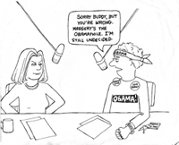 On TV and radio, he's interviewed former presidents and almost-presidents, but never the incumbent Barack Obama(though when the President called in to Jim and Margery's radio show to wish Governor Patrick well in late 2014, Jim did ask the Leader of the Free World if he had paid Somerville parking tickets from his time at Harvard Law). Braude has tried to be even-handed in the Obama discussions, though some listeners think he’s tipped his hand. Here’s a cartoon from one of them: