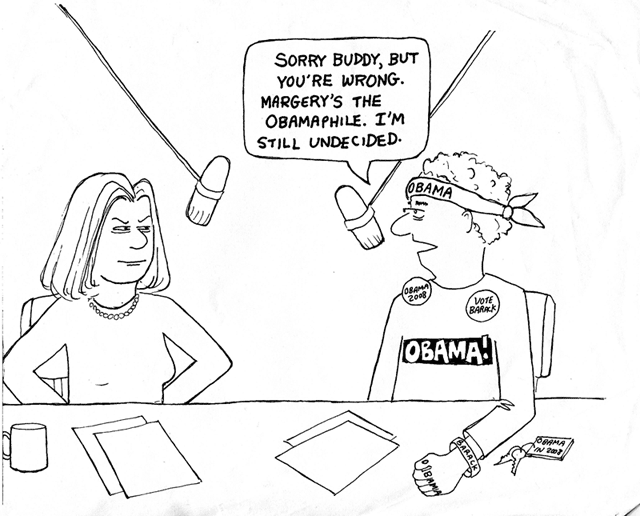 On TV and radio, he's interviewed former presidents and almost-presidents, but never the incumbent Barack Obama(though when the President called in to Jim and Margery's radio show to wish Governor Patrick well in late 2014, Jim did ask the Leader of the Free World if he had paid Somerville parking tickets from his time at Harvard Law). Braude has tried to be even-handed in the Obama discussions, though some listeners think he’s tipped his hand. Here’s a cartoon from one of them: